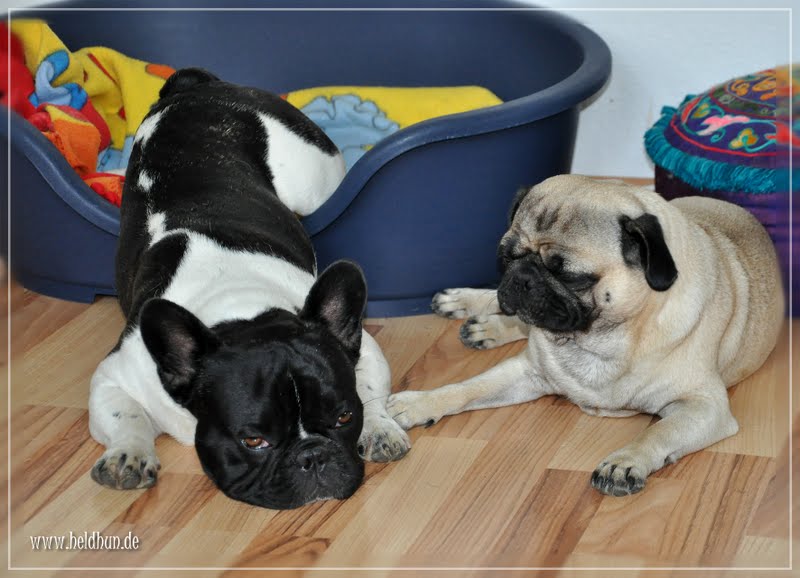 Zu Besuch sind heute auch die beiden Grunzehunde Arthus und Bruno, Frenchi und Mops. Die schlawenzelten immer um die Blättermagenparty herum und trauten sich nicht, ich hab ihnen dann geholfen und das Bauch-Vollschlagen hat dann auch ganz von allein geklappt.