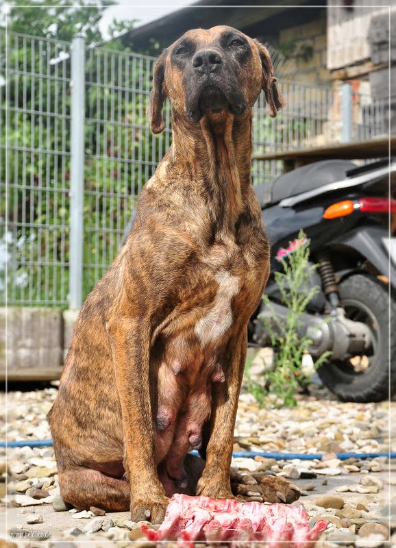Nina soll nicht mehr so viel Action haben, alles ein bisschen gemäßigter. Ich fütter genau passend, viel Fleisch und seltener Trockenfutter, außerdem habe ich noch ein paar Fütterungstips bekommen. Ich werd morgen ein bisschen Malzbier einkaufen, da sind gute B-Vitamine drin, ein pflanzliches Mittel, dass das Herz stärkt und einen Eimer Traubenkernpulver habe ich.